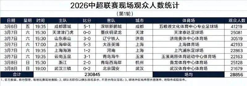 2026中超首轮战罢,官方公布的一个数字令人欣喜:现场观众场均达到28856人。8场比赛,总计230845名球迷走进球场,而且没有一场低于两万人。这个近2.9万人的场均数据,足以体现联赛人气的回暖。